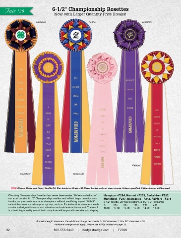 our most popular 6-1/2" Championship rosettes and added larger quantity price Mansfield - F247, Newcastle - F242, Fairford - F278